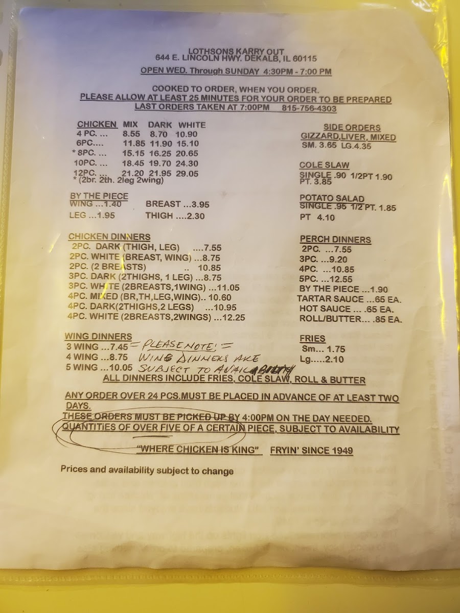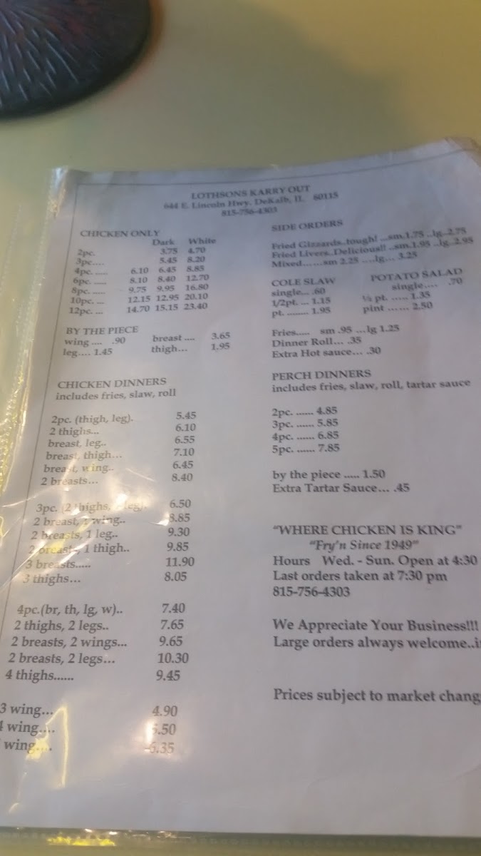 Welcome to Lothson's Karry Out, a hidden gem located at 644 E Lincoln Hwy, DeKalb, IL, serving unforgettable fried chicken and delightful sides. The establishment is known for its extensive menu, boasting a variety of chicken dinners that cater to all cravings. From the 4pc. Mixed or 2pc. Dark options to perfectly crispy 2 Breasts, 2 Wings, Lothson’s showcases the essence of classic fried chicken.